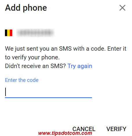 At this point Google might ask to enter your password for verification, so enter your password if prompted. Then you’ll see a screen where you can select your country and enter your phone number.