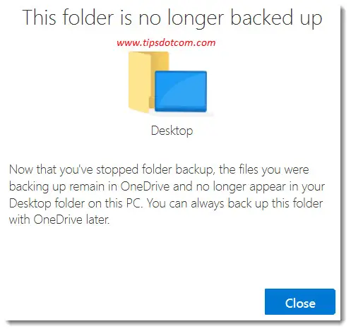 OneDrive will then show a confirmation message, informing you that this folder is no longer backed up.