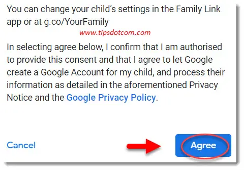 Now there’s one more screen explaining that you can manage the settings for your child’s account in Google Family Link, where you have to click “Agree” at the bottom of the page in order to continue.