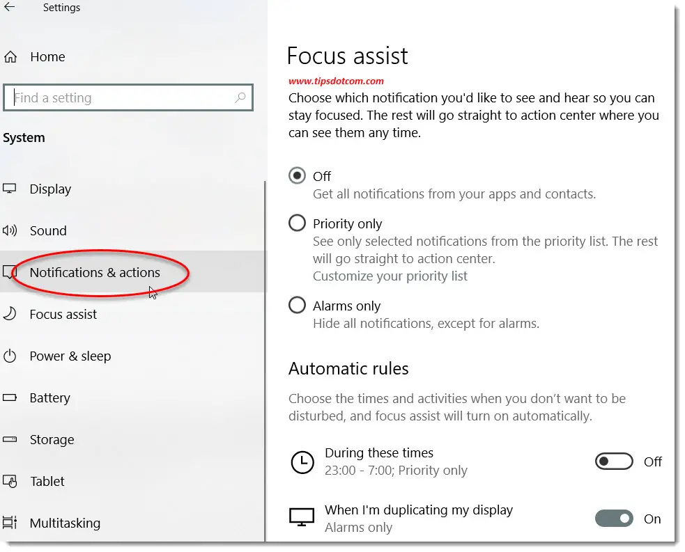 Here you can set times when you want to automatically disable notifications in Windows 10, or for instance when you’re duplicating your display or playing a game.
