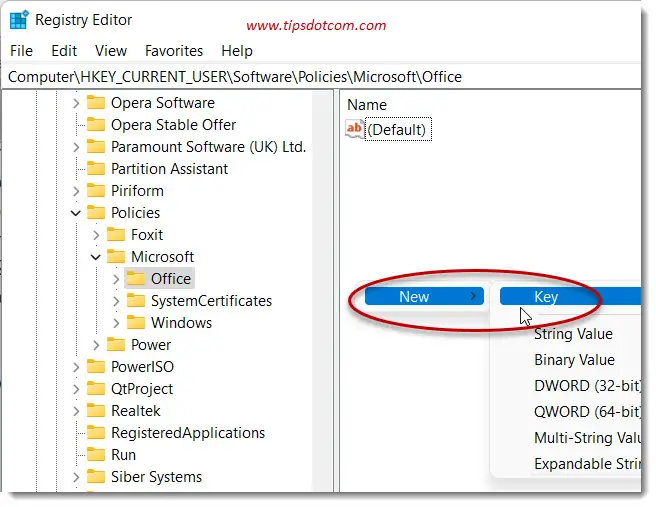 (you might have to create the key if it doesn’t exist - to do so, select the "Office key on the left, then right click in the right pane of the registry editor and select “new” and then “key”).